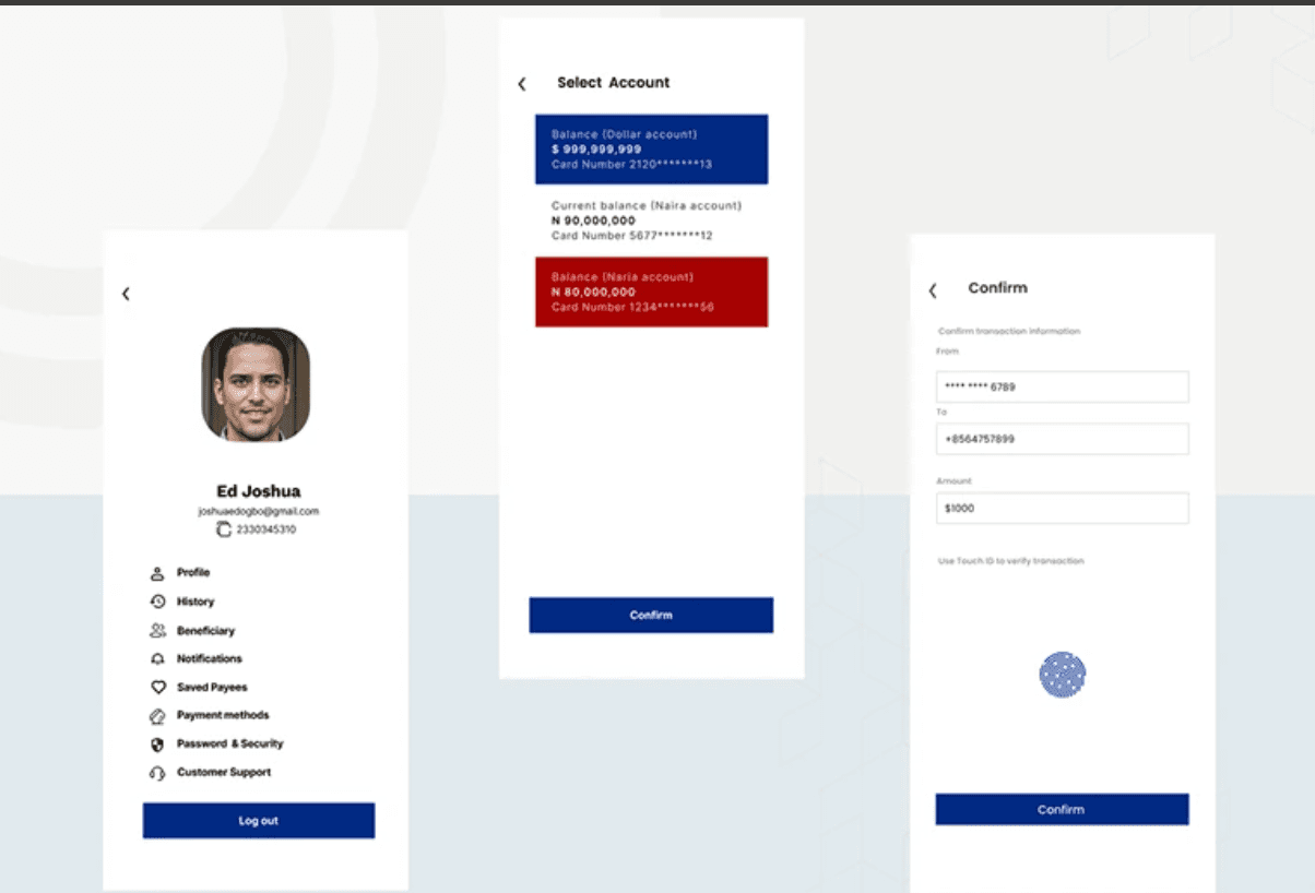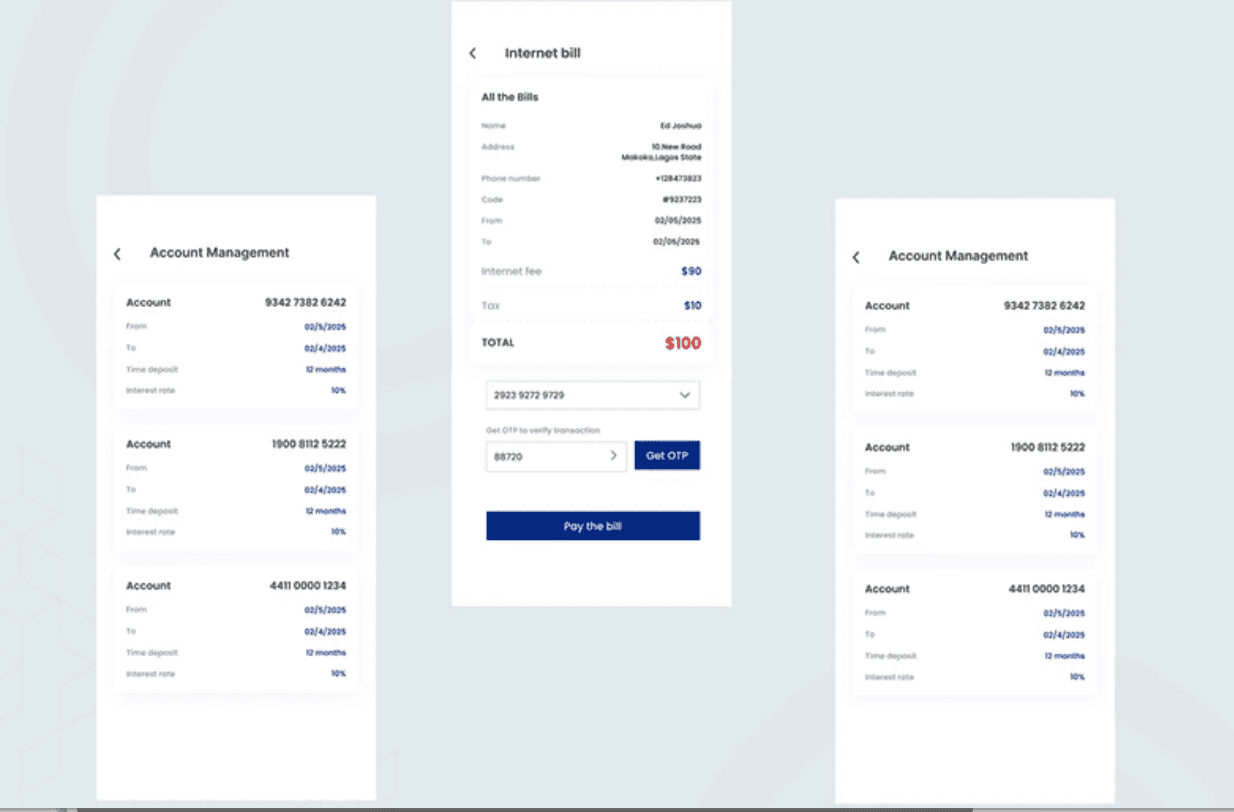 The layout was designed to balance simplicity with functionality. Clear visual hierarchy, responsive elements, and accessible components ensured that users could complete tasks quickly while enjoying a cohesive and professional banking experience.