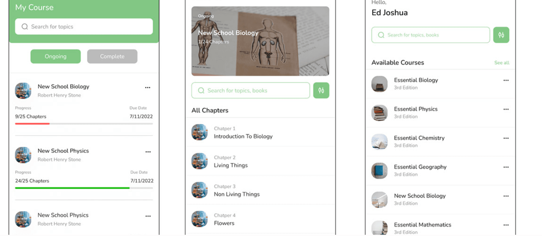 Simple, educational-themed icons and supportive illustrations were integrated to make navigation intuitive and to visually represent learning categories and progress.